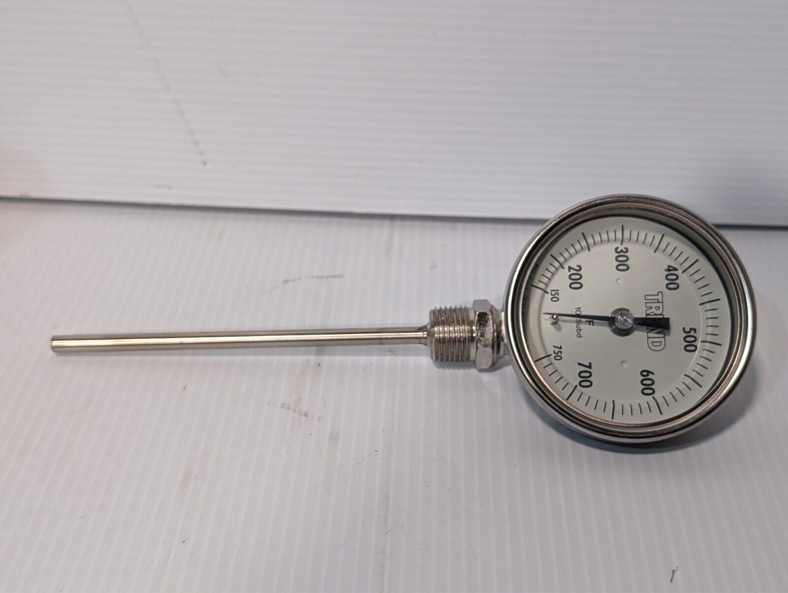 Trend 31 bimetal thermometer, 150-750 deg F, 6 inch stem, 1/2 NPT conn. New old stock. From the stockroom of a closing industrial facility. Note that this price is for one unit even though multiple are pictured.