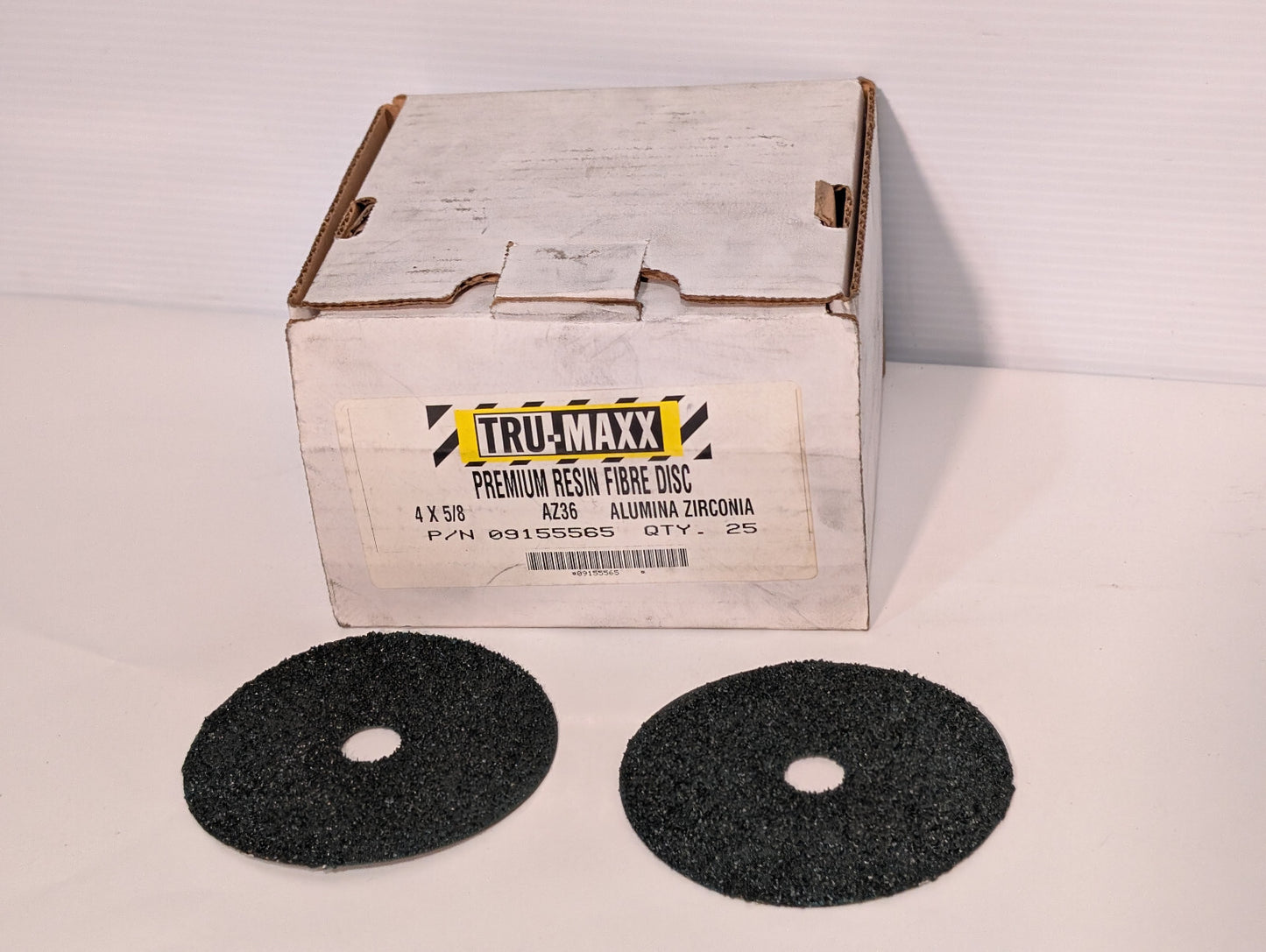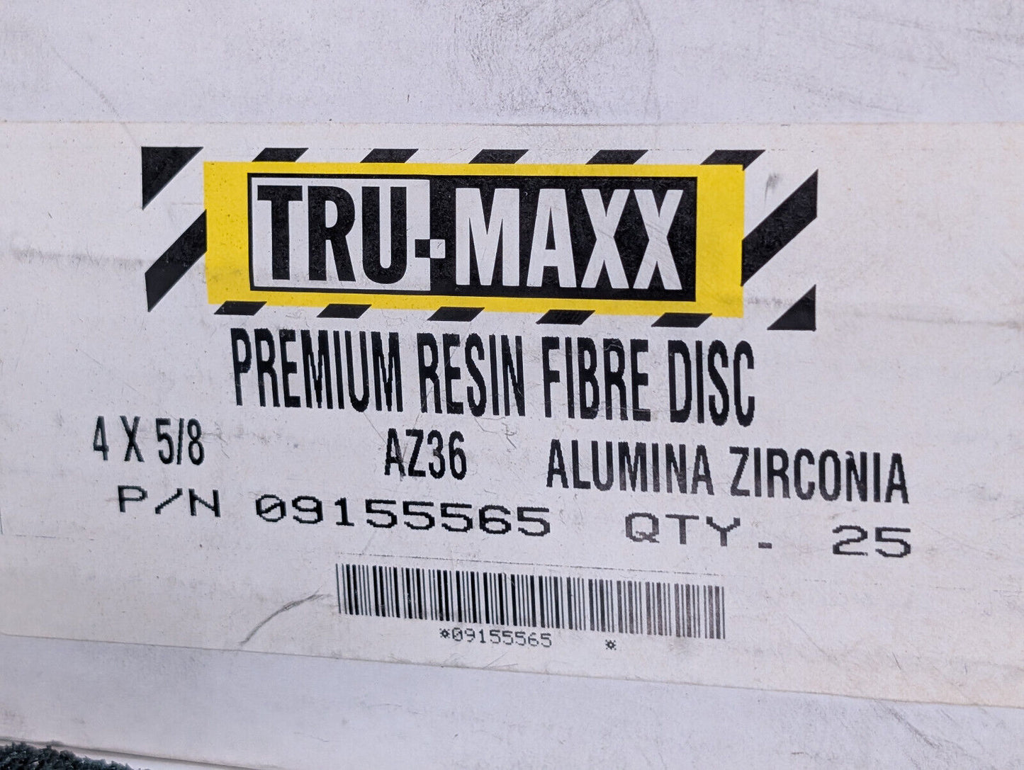 Tru-Maxx 25 count Box #09155565 premium resin fiber discs 4x5/8, 36 grit Alumina Zirconia. New old stock. From the stockroom of a closing industrial facility. Untested but presumed to be working well. Free shipping.